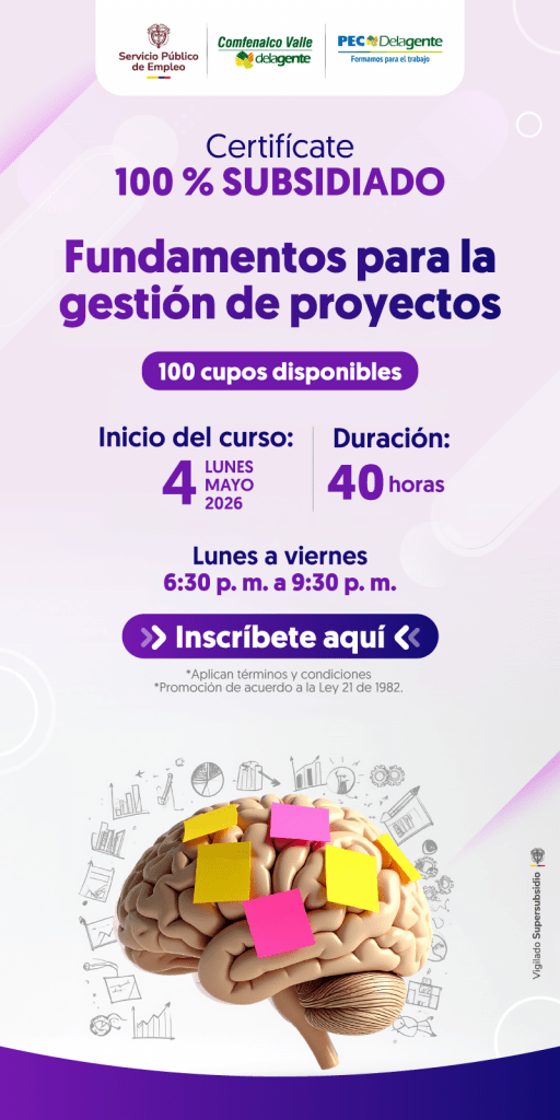 La Agencia de Empleo de Comfenalco Valle Delagente invita a los servidores públicos y contratistas de la Alcaldía de Cali, afiliados a participar en el curso “Fundamentos para la Gestión de Proyectos”, una capacitación certificada y 100% subsidiada, diseñada para fortalecer competencias clave en la planificación, ejecución y control de proyectos.